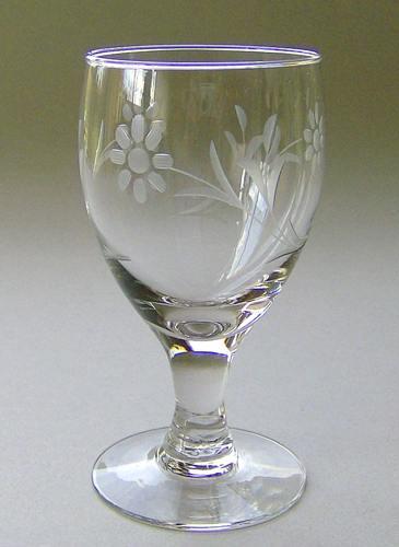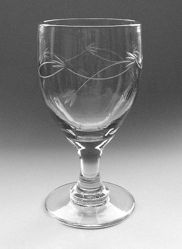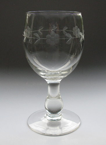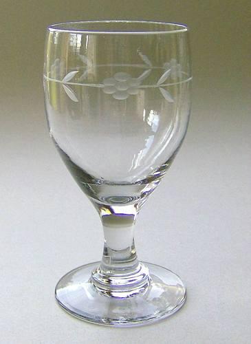 Porterglas med ægformet kumme på balusterformet stilk og flad fod. Kummen dekoreret med en slebet blomsterkrans, identisk med slibningen på Holmegaards "Hogla" glas.