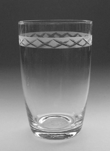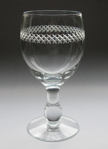 Porterglas med ægformet kumme på balusterformet stilk og flad fod. Kummen dekoreret med en krans af tætsiddende slebne krydser.