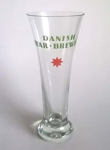 Højt udsvajet ølglas på kraftig massiv fod. På kummen trykt med emaljefarve "DANISH STAR . BREWERY" i grøn farve. Derunder en 8-takket stjerne i rød farve.