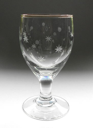 Øl eller porterglas "Hogla". Blæst i form som spidsglas, opdrevet og med påsat fod. Kummen dekoreret med matslebet stjerner og måner.