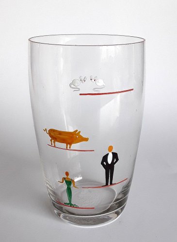 Tøndeformet øl- eller sjusglas med emaljemalet rød rand, på korpus malet 4 røde målestreger: Nederts en slank kvinde i grøn kjole, derefter en herre i sort tøj, ovenover en gris, og øverst 2 små mus med røde øjne.