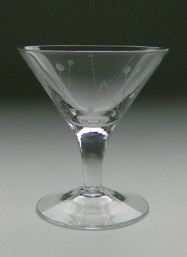 Likørskål eller cocktailglas med halvkugleformet kumme og kraftig fod, dekoreret med slebne stjerner og kugler.