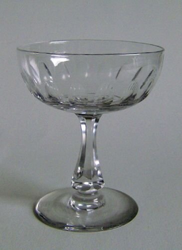 Champagneskål, fra servicet "Derby". Bred kumme med olivslibning på facetslebet balusterstilk og flad fod. Opdrevet, kuglet. Produceret på flere glasværker ca. 1890 til ca. 1950.