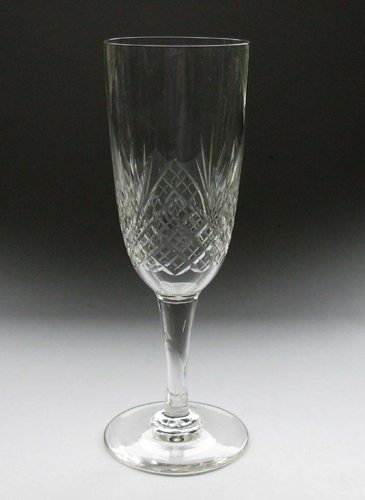 Champagnefløjte fra servicet Wellington med facetslibninger på den spidse kumme. Ligner tilsvarende fra servicet Berlinoir men bunden er plan og kantet, hvor Berlinoir er rund.