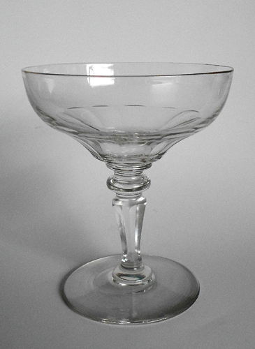 Champagneskål fra servicet "Margrethe" med indsvajet og halvt facetteret kumme på helfacetteret stilk med rund knap og flad fod. Kuglet i bund.