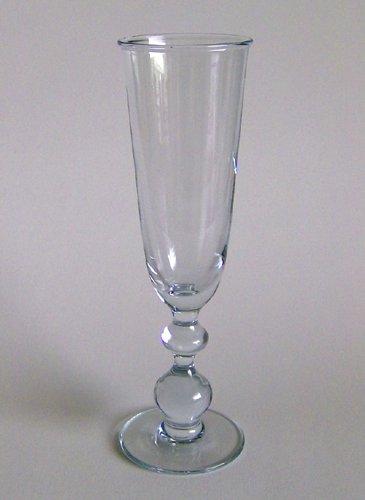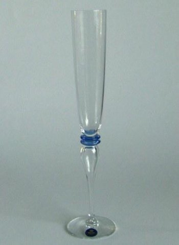 Høj slank champagnefløjte med flad fod fra servicet "Attica". Mellem den omvendt balusterformede luftfyldte stilk og kummen en dobbelt blå knap.
