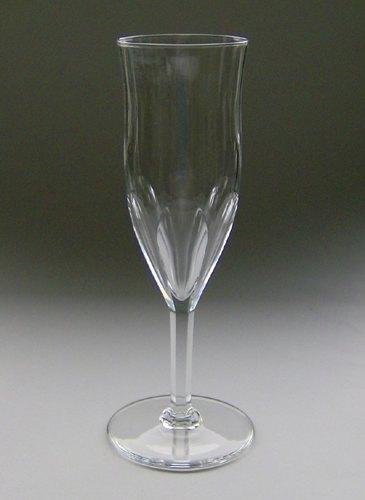 Champagnefløjte, fra krystalservicet "Oreste". Høj kumme med udsvajet rand og brede facetter på nederste del af kummen der fortsætter på stilken.