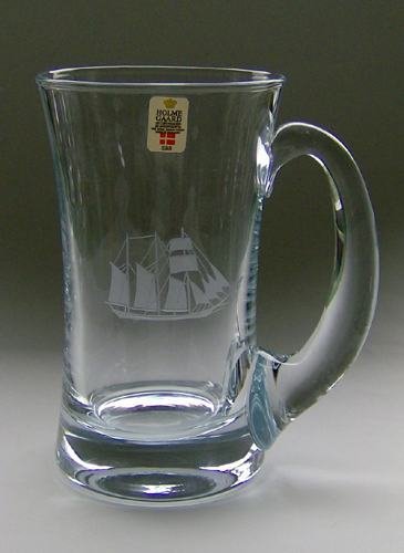 Stort ølkrus, kaldet "Skibshund", med tyk massiv bund og påsat hank, fra servicet "Skibsglas" På korpus graveret tremastet skib. Påsat label med nr. 286