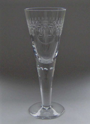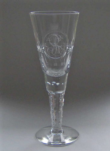 Pokal af blyglas gjort som spidsglas på flad fod, glat stilk med luftperler under kummen. Guillocheret bort om kummen med ovalt felt hvori graveret initialerne "H.J."