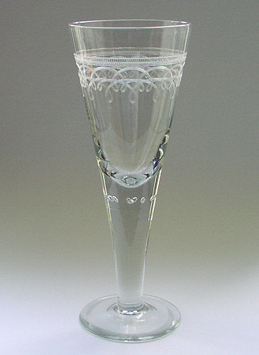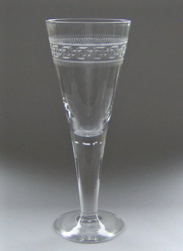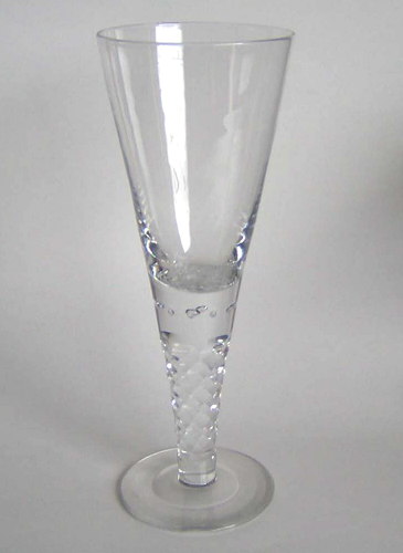 Pokal af blyglas, gjort som spidsglas på glat stilk med luftperler og flad fod. Om kummen guillocheret bort.