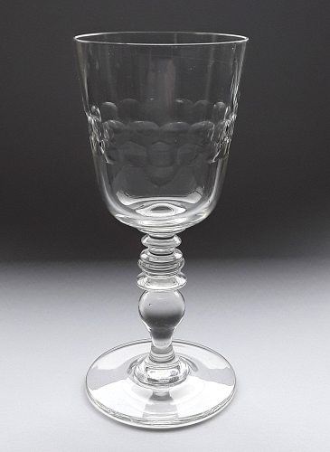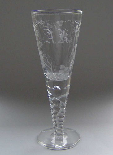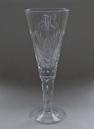 Pokal af blyglas gjort som spidsglas på flad fod, snoet stilk med luftperler mellem kumme og stilk. På kummen matslebet vinløv med blankslebne drueklaser og initialerne " A.K."