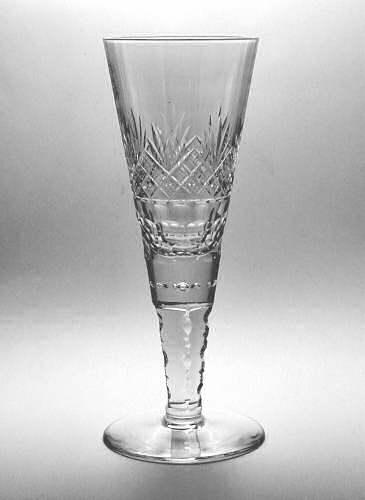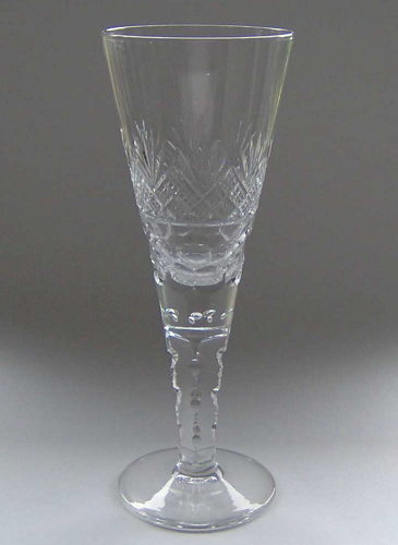 Pokal af blyglas gjort som spidsglas på flad fod, stilk med luftperler under kummen. Kummen skærsleben i vifte og brillantslibning over skælslebet bånd, stilken slebet 5-kantet med diverse hul og hak slibninger.