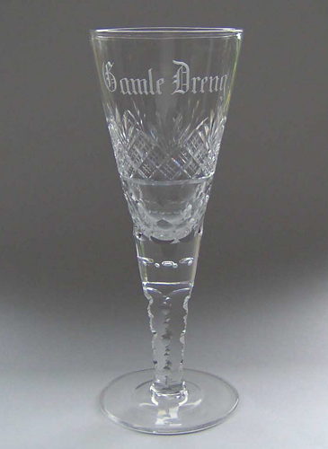 Pokal af blyglas gjort som spidsglas på flad fod, stilk med luftperler under kummen. Kummen skærsleben i vifte og brillantslibning over skælslebet bånd, stilken slebet 5-kantet med diverse hul og hak slibninger. Øverst matslebet devise "Gamle Dreng"