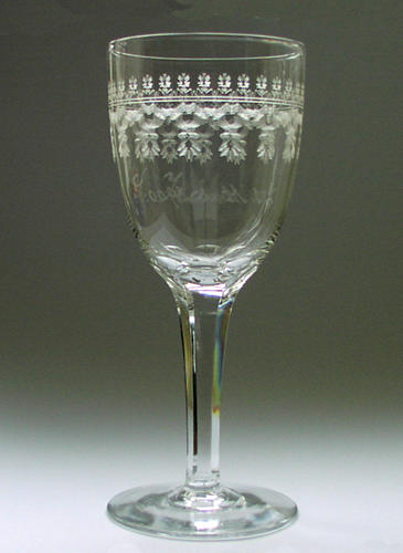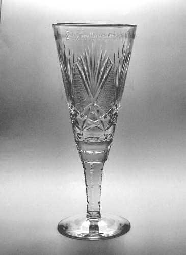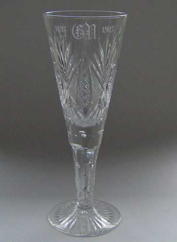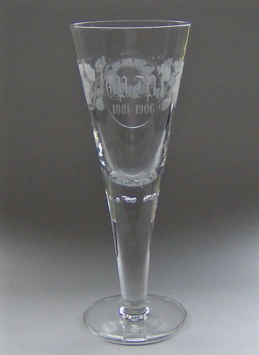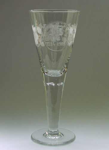 Pokal af blyglas gjort som spidsglas på flad fod, glat stilk med luftperler under kummen. Om kummen pantograferet blomsterfrise og heri skærslebet ovalt felt med teksten "I.U. 1884 - 1909"