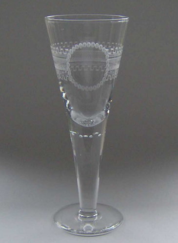 Pokal af blyglas gjort som spidsglas på flad fod, glat stilk med luftperler under kummen. Guillocheret bort om kummen med ovalt felt bestående af små matslebne ovaler.