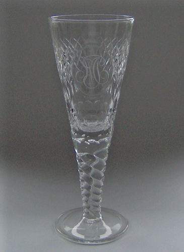 Pokal af blyglas gjort som spidsglas med flad fod, med luftperler under kummen og snoet stilk. Kummen rigt dekoreret med skærslibning og skælslibning samt et ovalt felt med initialerne "PM"