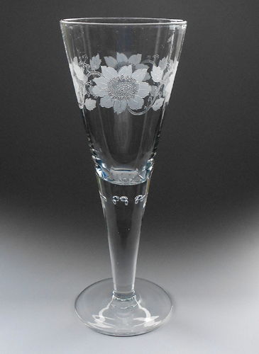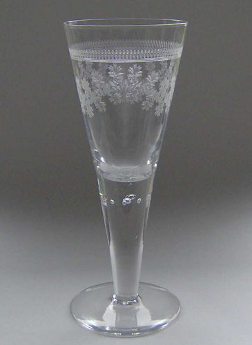 Pokal af blyglas gjort som spidsglas på flad fod, stilk med luftperler under kummen. Om kummen pantograferet en blomsterfrise.