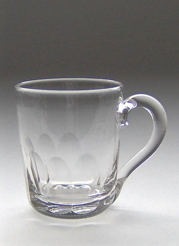 Konisk krus med påsat hank, underste del af kruset slebet med langstrakte oliver.