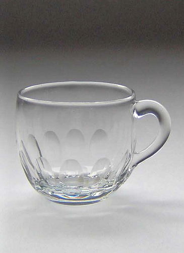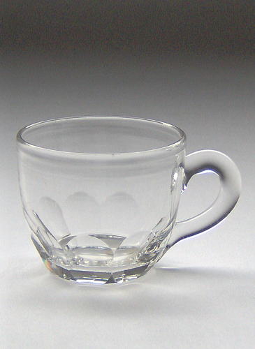 Lille krus med påsat hank, facetslebet underdel og afrundet bund.