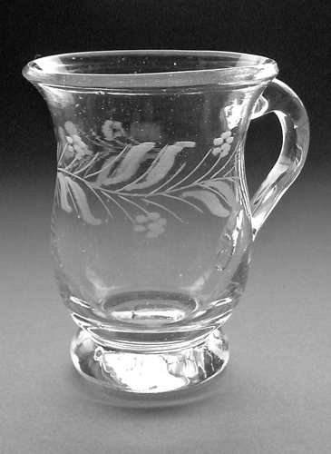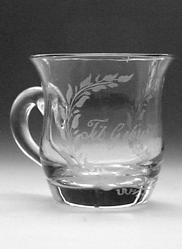 Punchebæger med ranke af pilekviste og teksten "Til Geburts dagen". Dette Punchebæger kunne godt være Holmegaard katalog 1853 "Punchebæger nr. 3" På tegningen i kataloget forekommer det lidt smallere og hanken er større og er hæftet højere oppe, til gengæld passer størrelsen godt, det indeholder 1/12 pot.