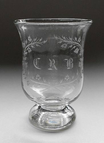 Punchebæger, glat tykvægget, klokkeformet kumme på massiv ringfod. På kummen Iserhorst gravering "C R B" omkranset af pileblade og blomster.