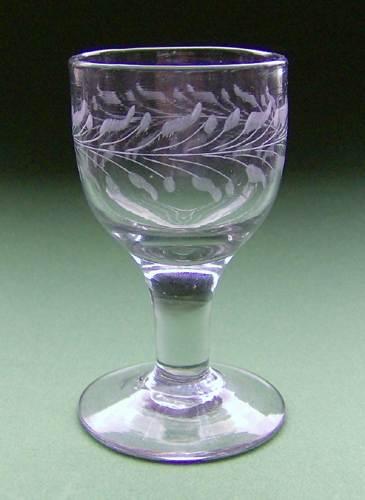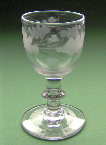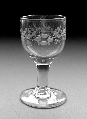 Snapseglas formet som spidsglas med glat stilk. Dekoreret med en matslebet ligeløbende frise, bestående af pileblade og blomster. Slebet af Iserhorst.