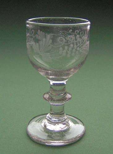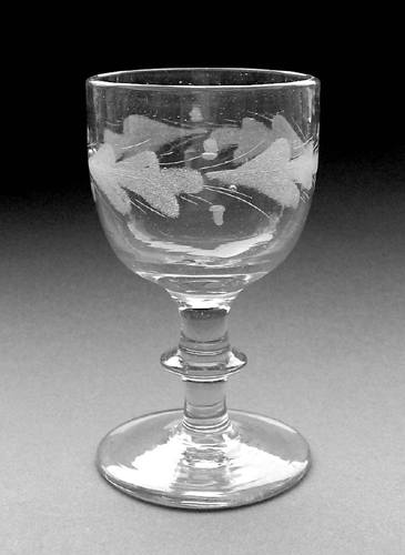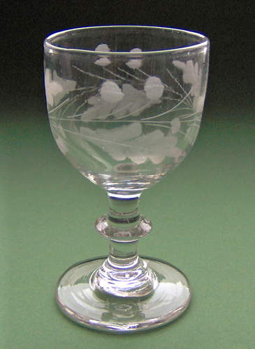Vinglas med høj rundbuet kumme på stilk med knap. Dekoreret med matslebet bølget egeløvsfrise af fire 7-fligede blade uden nervestreger, to agern og stilke skiftevis over og under bladene.