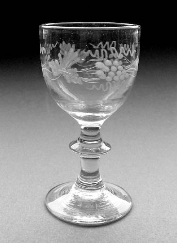 Vinglas formet som spidsglas med glat stilk. Dekoreret med matslebet let bølget vinløvsranke af tre 15-fligede blade, drueklaser med 15 druer og fangtråde der vender hver sin vej mellem bladene. (Modsat løbende)