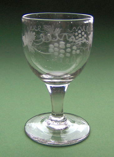 Vinglas formet som spidsglas med glat stilk. Dekoreret med matslebet bølget vinløvsranke af tre 3-delte takkede blade, drueklaser med 15 druer og fangtråde der vender hver sin vej mellem bladene. (Lodret type)