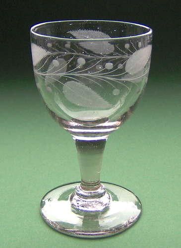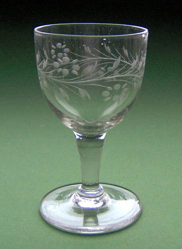 Snapseglas formet som spidsglas med glat stilk. Dekoreret med en matslebet frise, bestående af skiftevis pileblade og små bær på stilke. Slebet af Iserhorst.