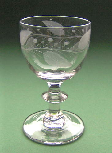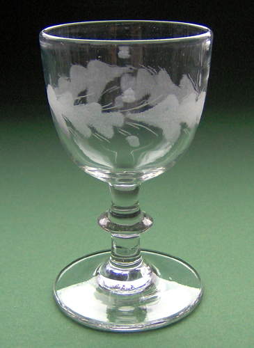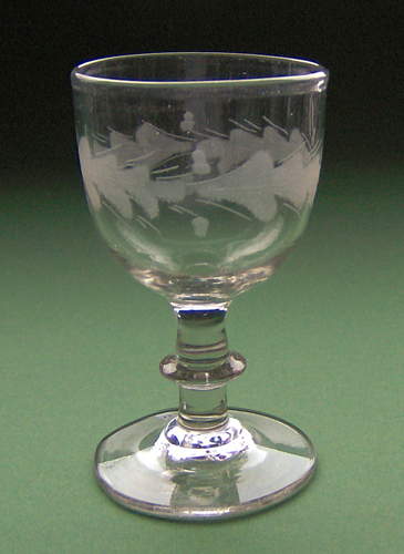Vinglas med rundbuet kumme på stilk med knap. Dekoreret med matslebet vandret egeløvsfrise af fire 7-fligede blade med nervestreger, to agern mellem bladene, samt lange dobbelte stilke omkring bladene. (Dobbelttrådet type)