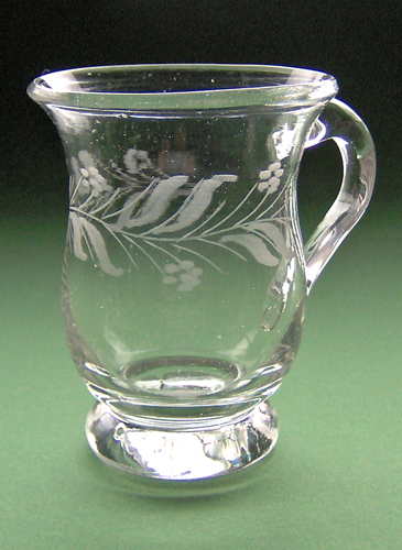 Vinglas formet som spidsglas. Dekoreret med matslebet let bølget vinløvsranke af tre 15-fligede blade, drueklaser med 15 druer og fangtråde der vender hver sin vej mellem bladene (dobbeltløbende).