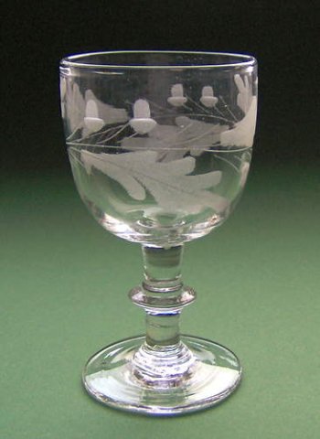 Vinglas med høj rundbuet kumme på stilk med knap. Dekoreret med matslebet bølget egeløvsfrise af fire 7-fligede blade uden nervestreger, to agern og stilke skiftevis over og under bladene.