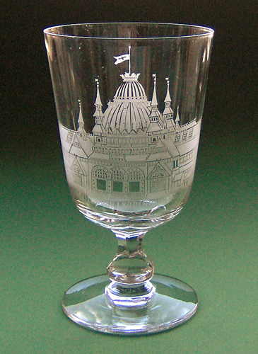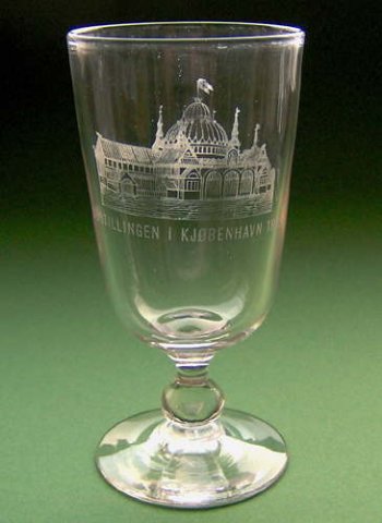 Øl,porter eller toddyglas, høj rundbuet kumme på kort påsat balusterformet stilk. På kummen matætset motiv med påskriften: " UDSTILLINGEN I KJØBENHAVN 1888 " med blokskrift i to linier.