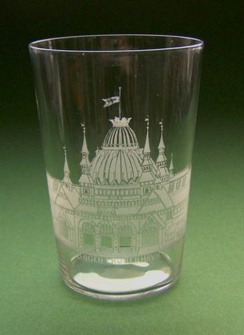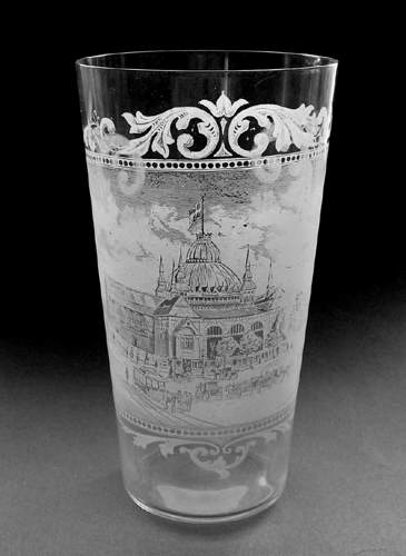 Bægerglas, tyndvægget og med tynd planslebet bund, på korpus matætset: Industriudstillingsbygningen med teksten " UDSTILLINGEN I KÖBENHAVN 1888 "