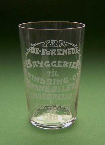 Lille ølglas, konisk glat med afsprængt forgyldt rand, på korpus matætset " FRA DE . FORENEDE BRYGGERIER TIL ERINDRING . OM KRONE-ØLLETS INDFØRELSE I DANMARK " samt logo DFB. Bryggeriet "Krone-Øl Bryggeriet" Vodroffsvej, København, udsendte det første øl med navnet "Krone-Øl" i 1895