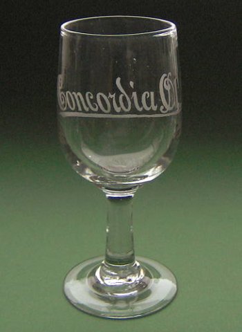 Stort ølglas, Bodega type men med mollex og let konisk stilk der er tykkest forneden. På kummen matætset: "Concordia Øl" med streg under. Bryggeriet "Concordia" Bagerstræde i Svendborg, blev i år 1900 opkøbt af "Svendborg Bryghus"