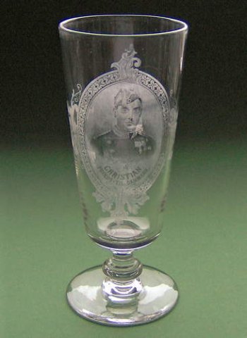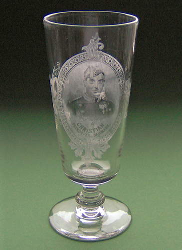 Porter eller toddyglas, høj konisk kumme på lille stilk med rund knap. På kummen matætset motiv: CHRISTIAN PRINDS TIL DANMARK.