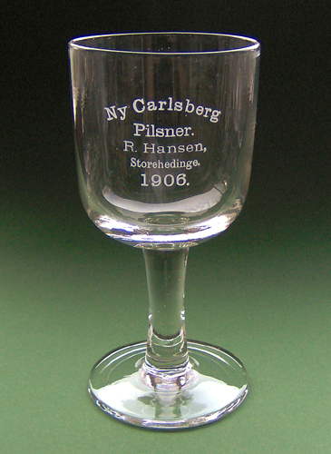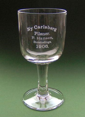 Ølglas, rundbuet kumme på lige glat stilk. På kummen matætset reklametekst:Ny Carlsberg Pilsner, R.Hansen, Storehedinge 1906