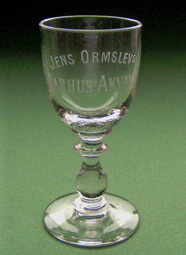 Snapseglas, rundbuet kumme på Mathilde stilk. På kummen matætset " JENS ORMSLEV´s AARHUS AKVAVIT ".