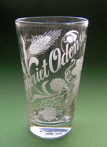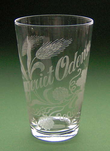 Vandglas, konisk med matætset motiv: Ranke af humle og aks, med teksten "Bryggeriet Odense"