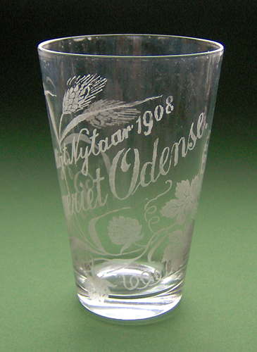 Vandglas, konisk med matætset motiv: Ranke af humle og aks, med teksten "Glædeligt Nytår 1908 Bryggeriet Odense"