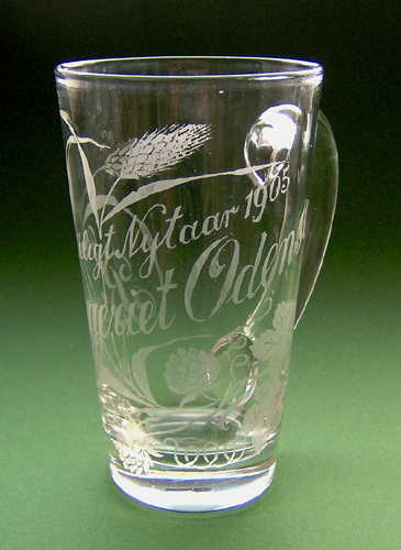 Ølkrus, konisk med påsat hank, dekoreret med matætset motiv: Ranke af humle og aks, og med teksten "Glædeligt Nytår 1905 Bryggeriet Odense"