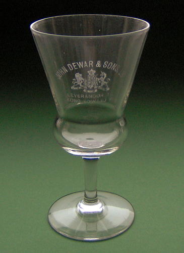 Konisk kumme med målesæk i bunden på glat stilk og flad fod. På kummen matætset firmanavn: JOHN DEWAR & SONS, LD. over våbenskjold, og derunder: LEVERANDØR TIL KONG EDWARD VII.