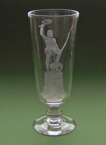 Porter eller toddyglas, høj konisk kumme på lille stilk med rund knap. På kummen matætset motiv: Den tapre landsoldat 6. JULI 1849.