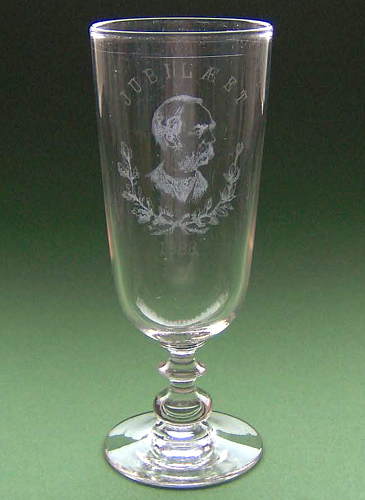 Toddy eller porterglas på lav balusterformet stilk med knap. På kummen matætset Christian IX´s portræt og lauerbærkrans, samt teksten "JUBILÆET 1888" i anledning af kongens 25 års jubilæum. Glasset findes også med dronning Louises portræt.