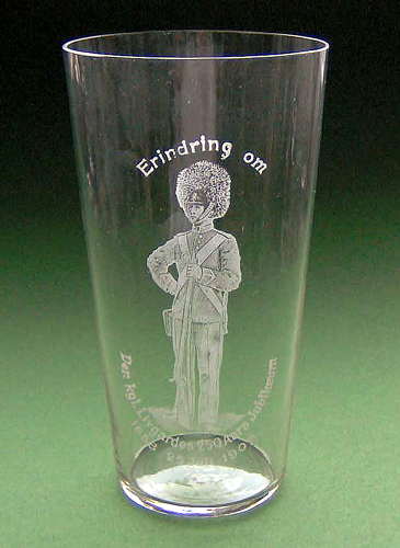 Konisk vandglas. På kummen matætset billede af garder og teksten "Erindring om" over garder og under denne " Den Kgl. Livgardes 250 Aars Jubilæum 1658 25 Juli 1908."
