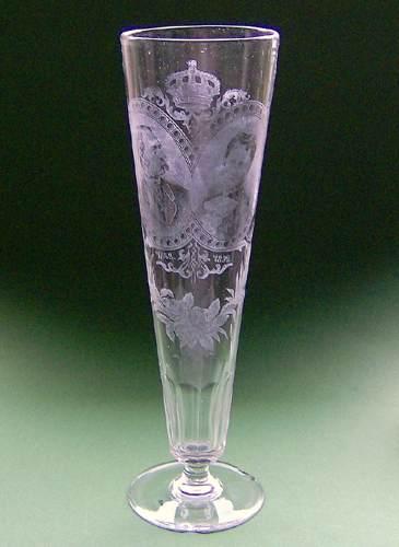 Høj slank porterfløjte på meget kort stilk, med facetslibning på nederste del af kummen. På kummen matætset Christian IX´s og Dronning Louise´s portrætter i ovaler med krone over og blomsterkrans, samt teksten "1842 - 1892" i anledning af regentparrets guldbryllup.