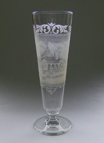 Høj slank porterfløjte på lille stilk og flad fod. På korpus matætset: Billede af bygningen fra industriudstillingen i København 1888.