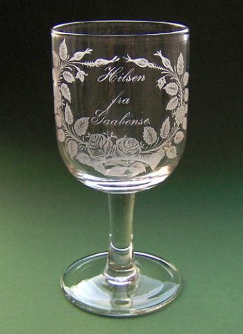 Ølglas, rundbuet kumme på lige glat stilk. På kummen matætset en rosenkrans, og heri devisen: "Til Lykke"